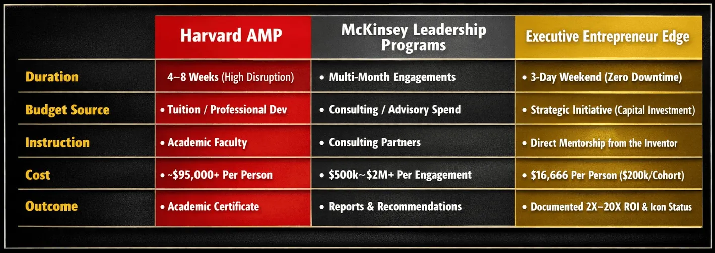 Elite Leadership Offsites deliver the same or greater ROI as traditional leadership programs — in 72 hours instead of 6–12 months.